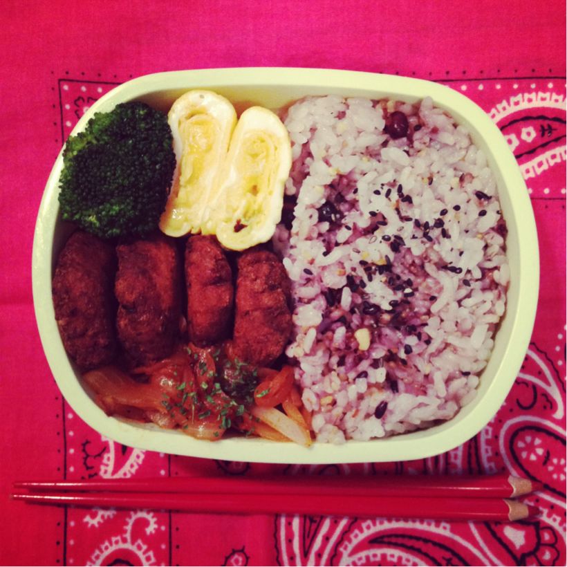 中身は、十六穀米、厚焼き卵、おからのチキンナゲット、ブロッコリー、玉ねぎのケチャップ炒めです。