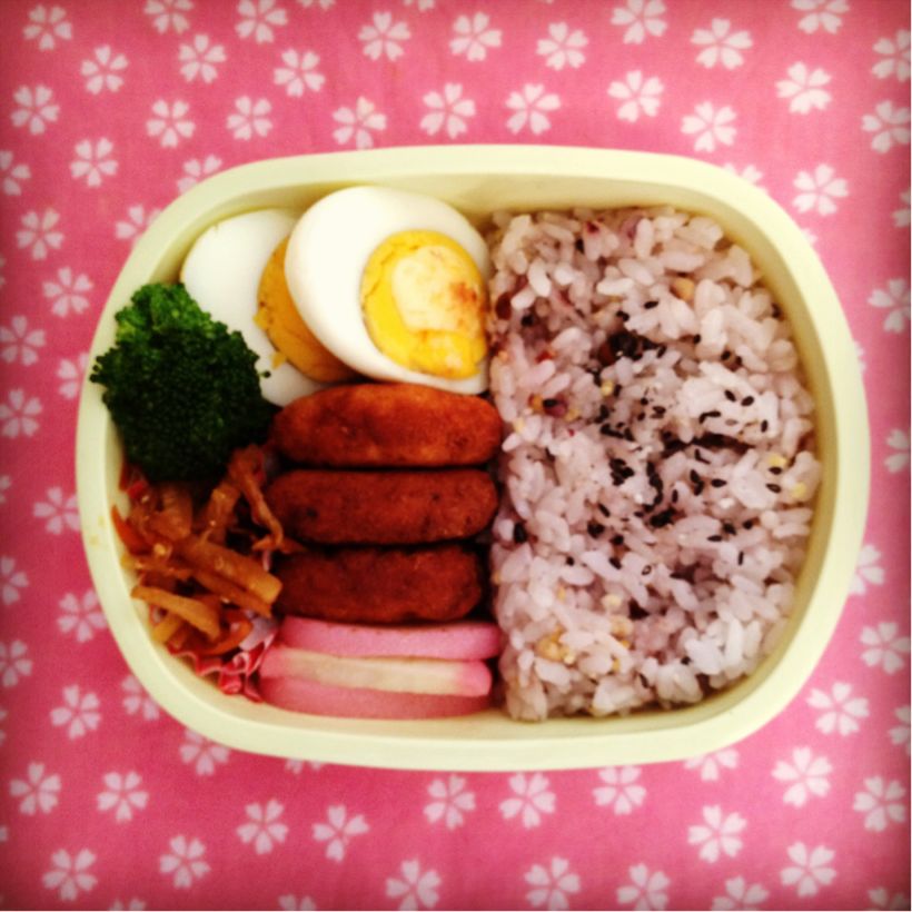 中身は、ゆでたまごのマヨネーズ焼き、おからのチキンナゲット、ブロッコリー、大根と人参の皮のきんぴら、かまぼこです。