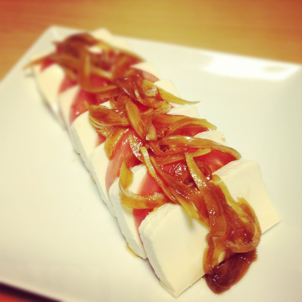 今朝豆腐を水切りしておいて、トマトと豆腐を1cm幅に切って、カプレーゼ風にしました。