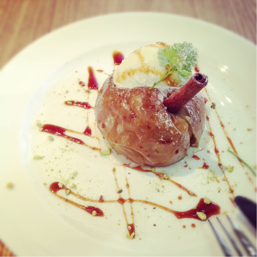 シナモンたっぷりの焼きりんご、アイスクリームもおいしい。